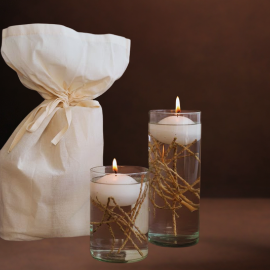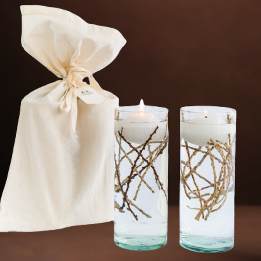 Dos cilindros de cristal, dos velas flotantes, dos amarres de palitos para sumergir dentro de...