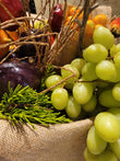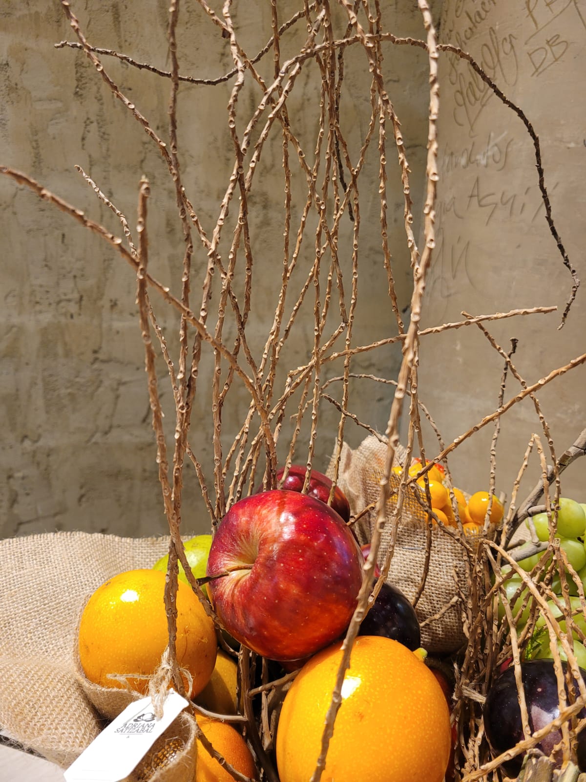 Hielera con 9 variedades de frutas, entre manzanas, peras, duraznos, granadillas, kiwis, ciruelas, uvas, uchuvas y fresas, con complementos decorativos.