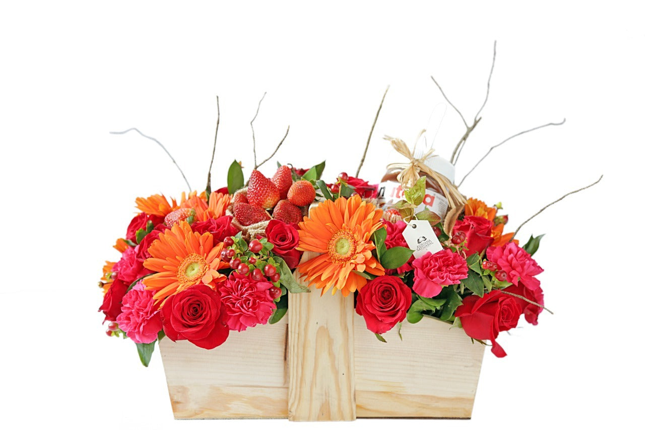 Canasto de madera con flores frescas, gérberas, dianthus y complementos, acompañado de fresas y nutella.