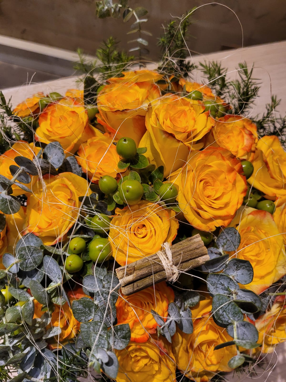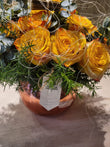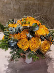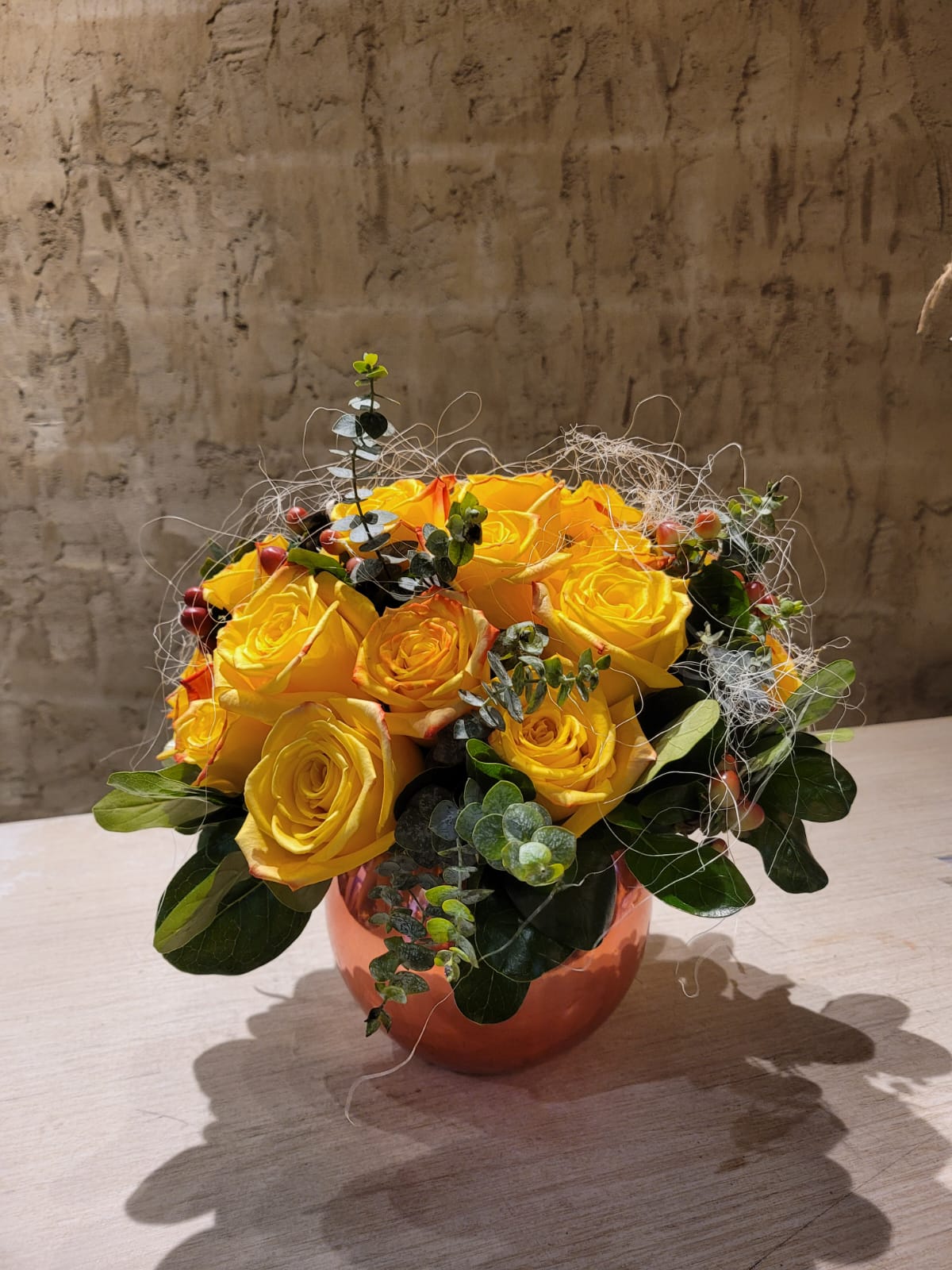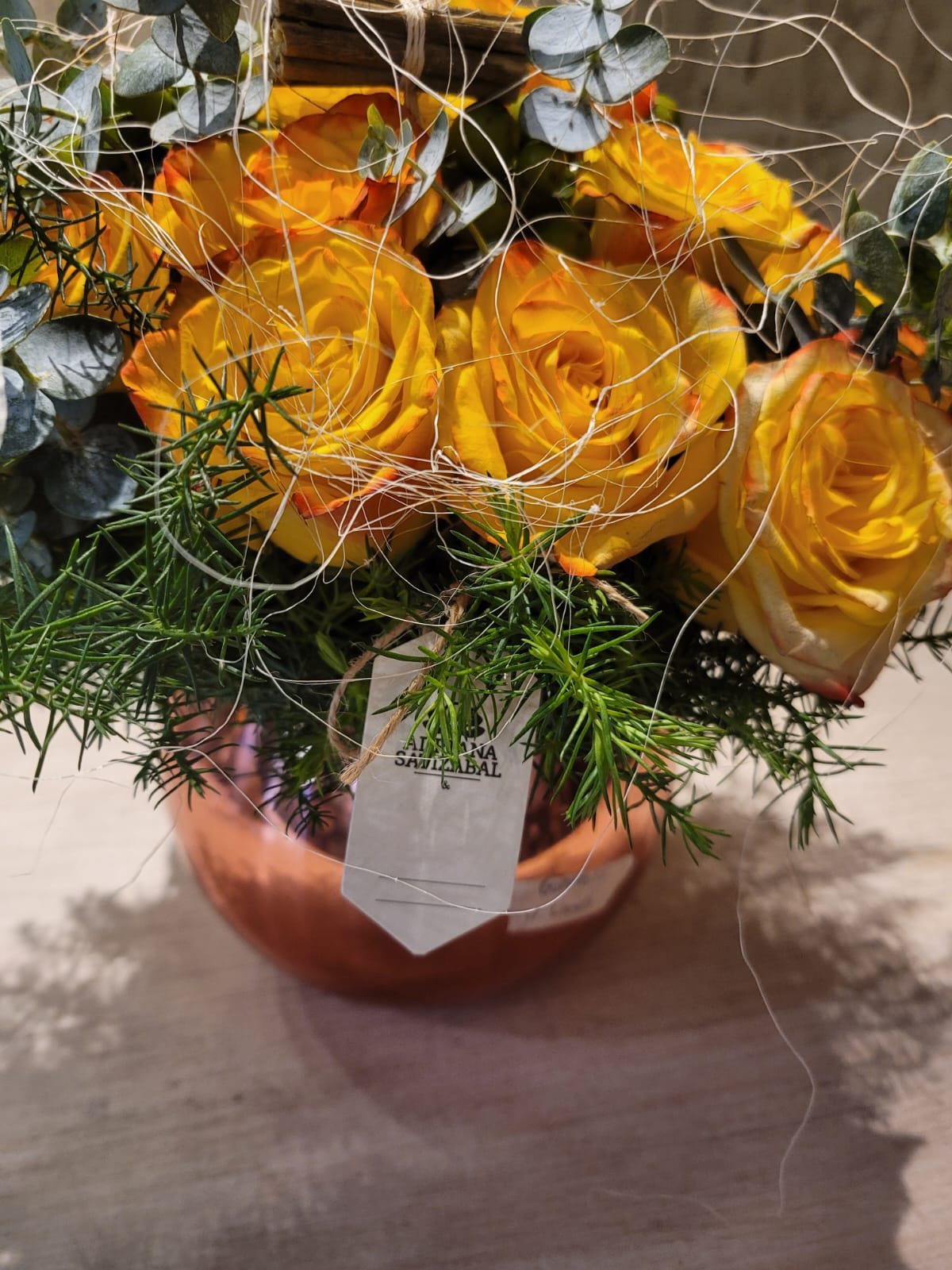 Diseño floral con 24 rosas frescas de exportación en esfera pequeña de aluminio reutilizable, con complementos verdes y secos.