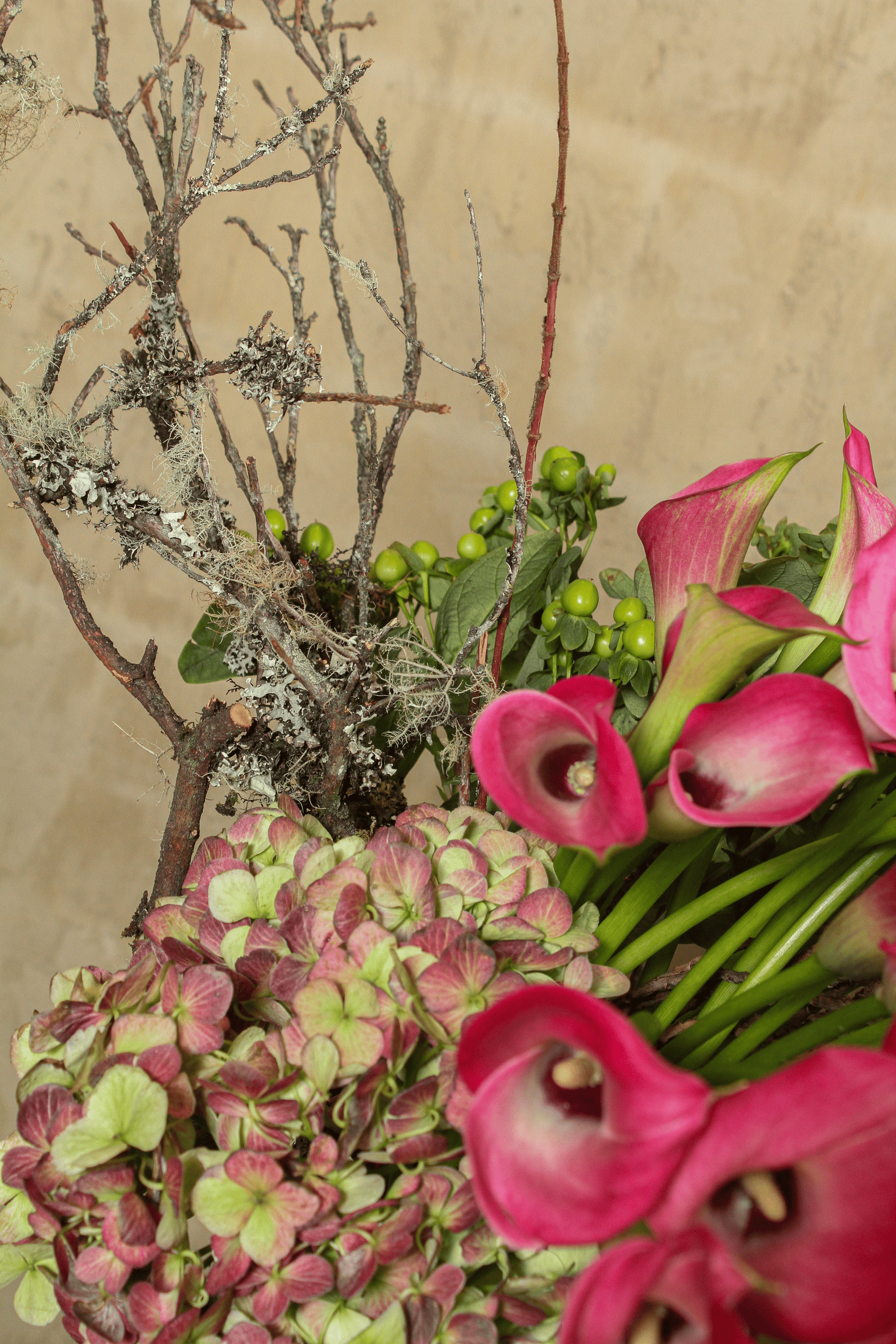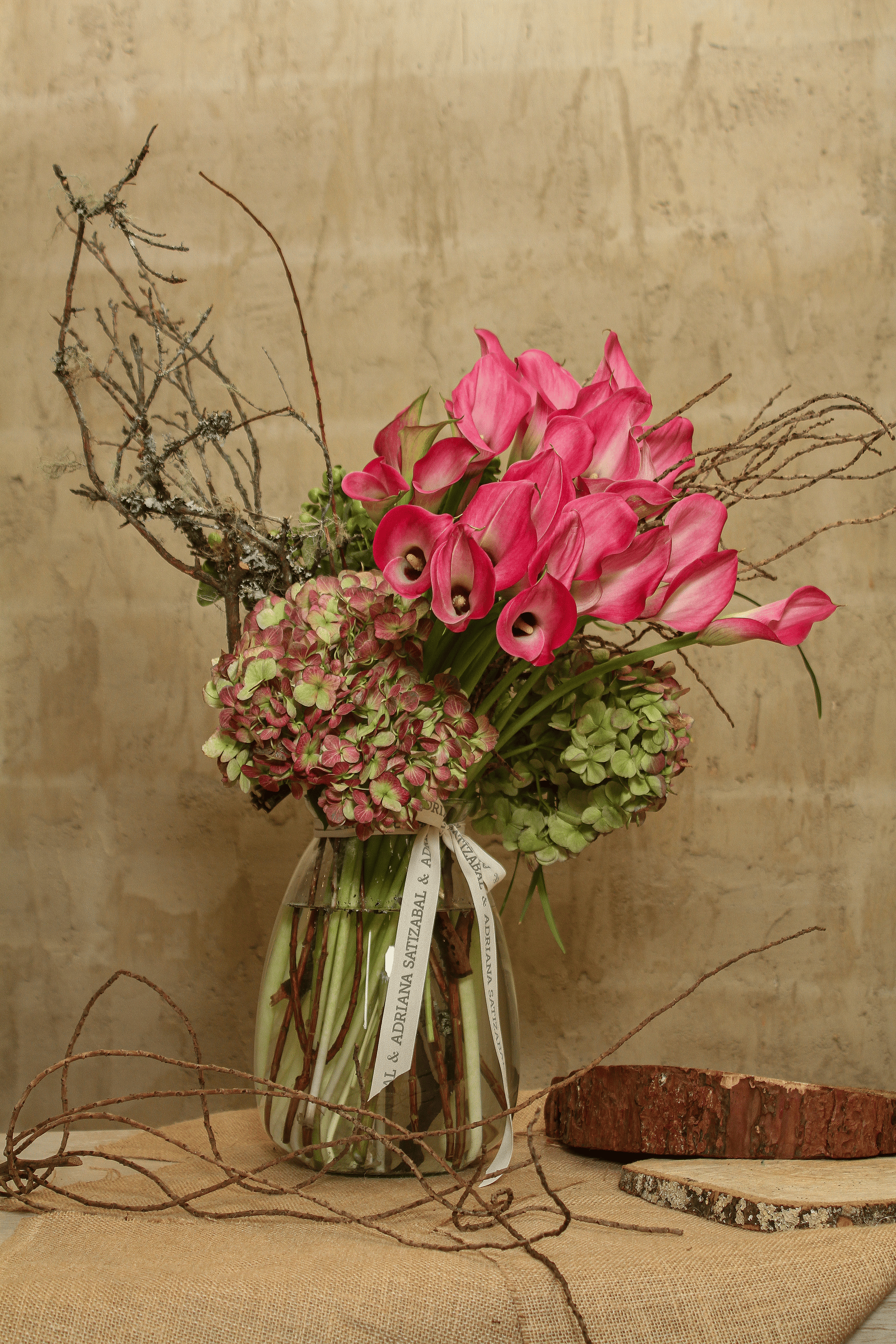 Raices de estrella, florero de cristal reutilizable, exóticas y alegres callas, imponentes hortensias, enigmatico hypericum.