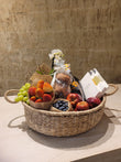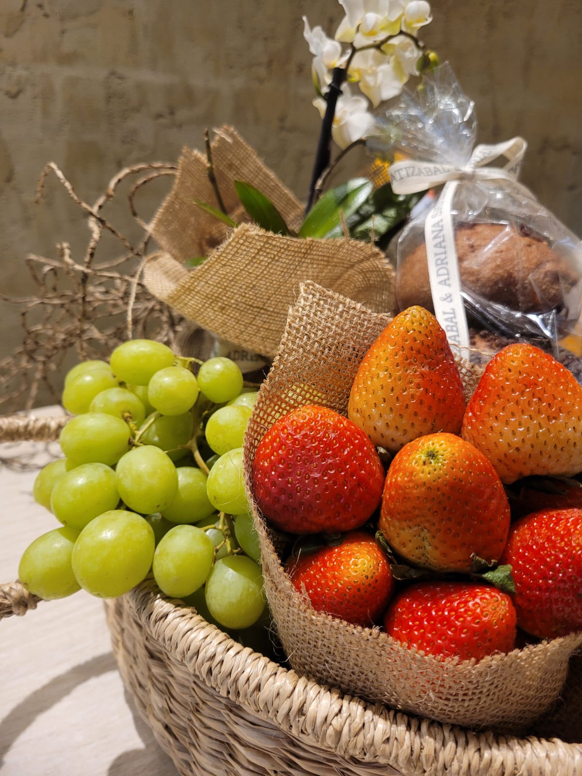 Canasto tejido con: Pan masa madre brownie, Fresas, Arándanos, Uvas, Manzanas, Proseco Sor Sandra Doc, Cholocates Moxe.